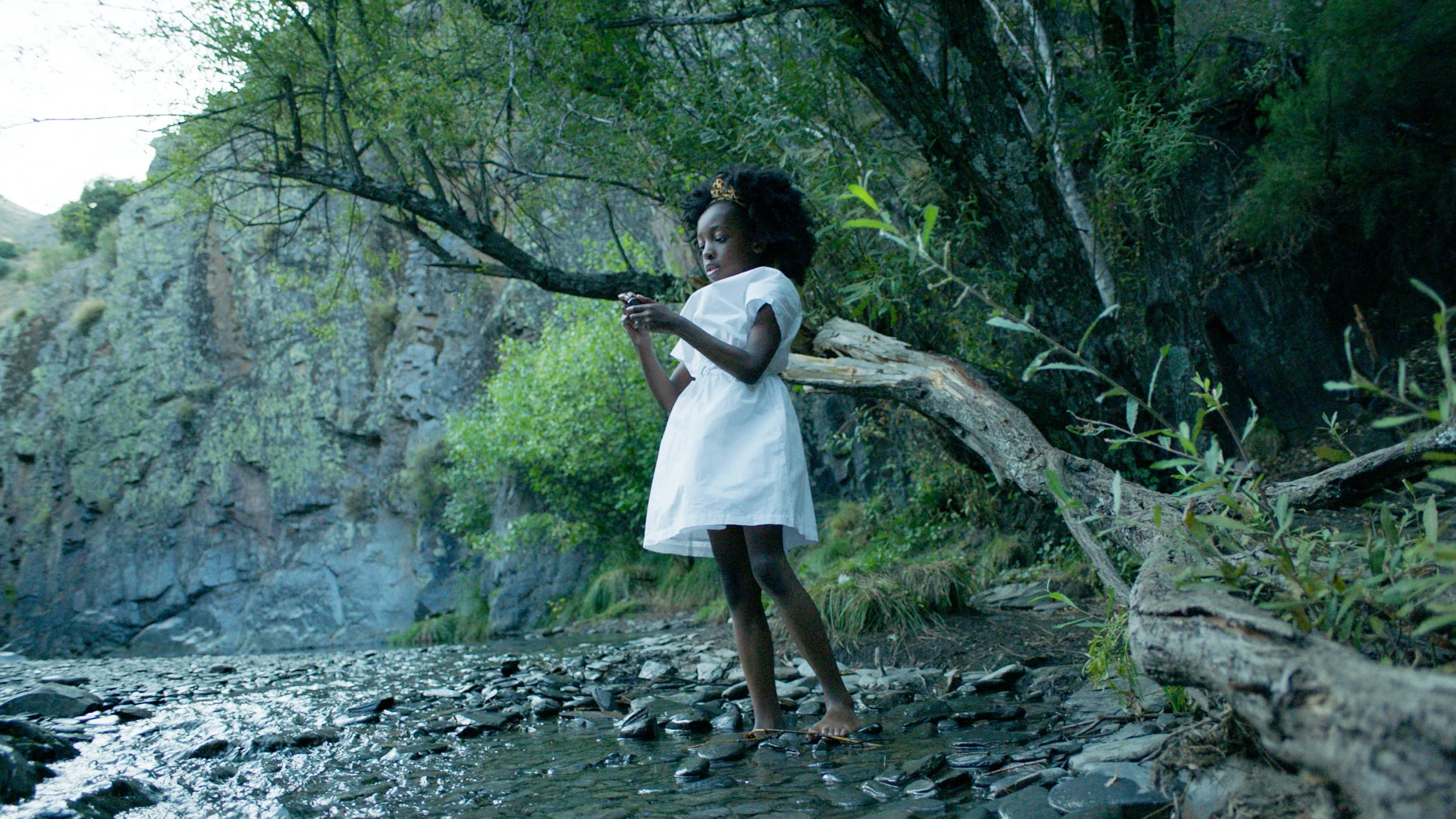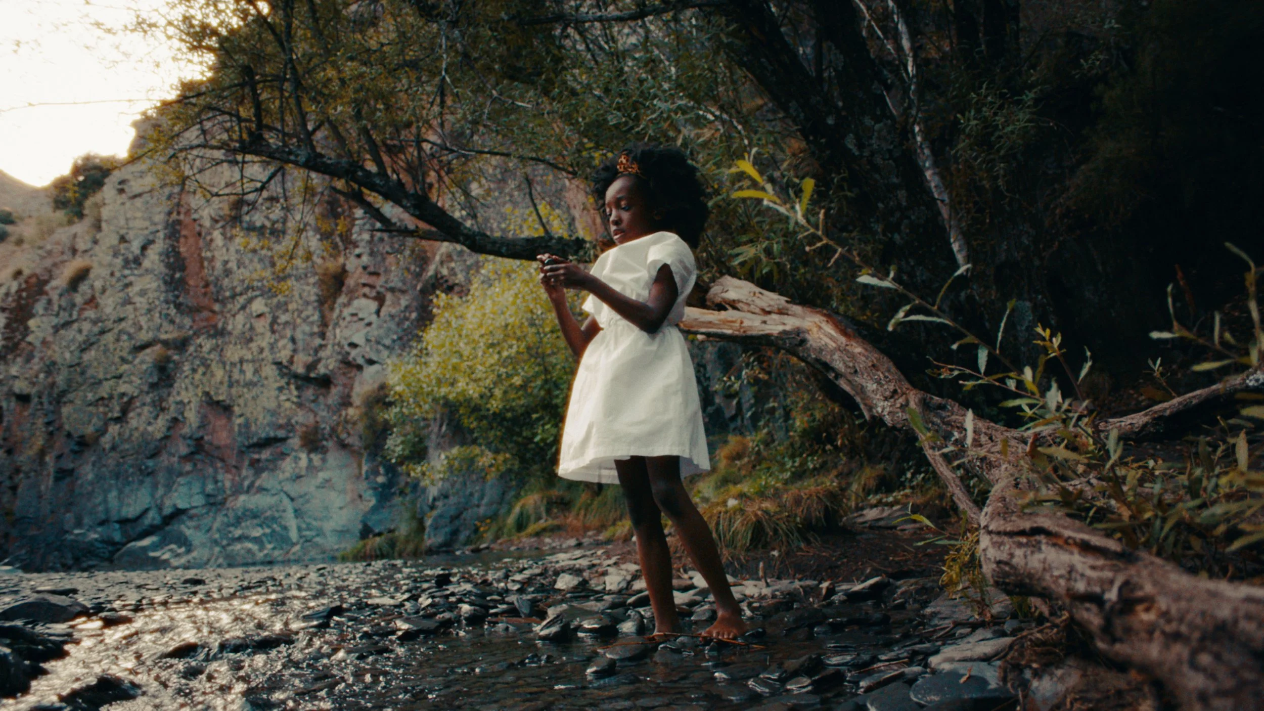 A young girl in a white dress standing barefoot in a shallow rocky stream, with a large tree and rocky cliff in the background, during daylight.