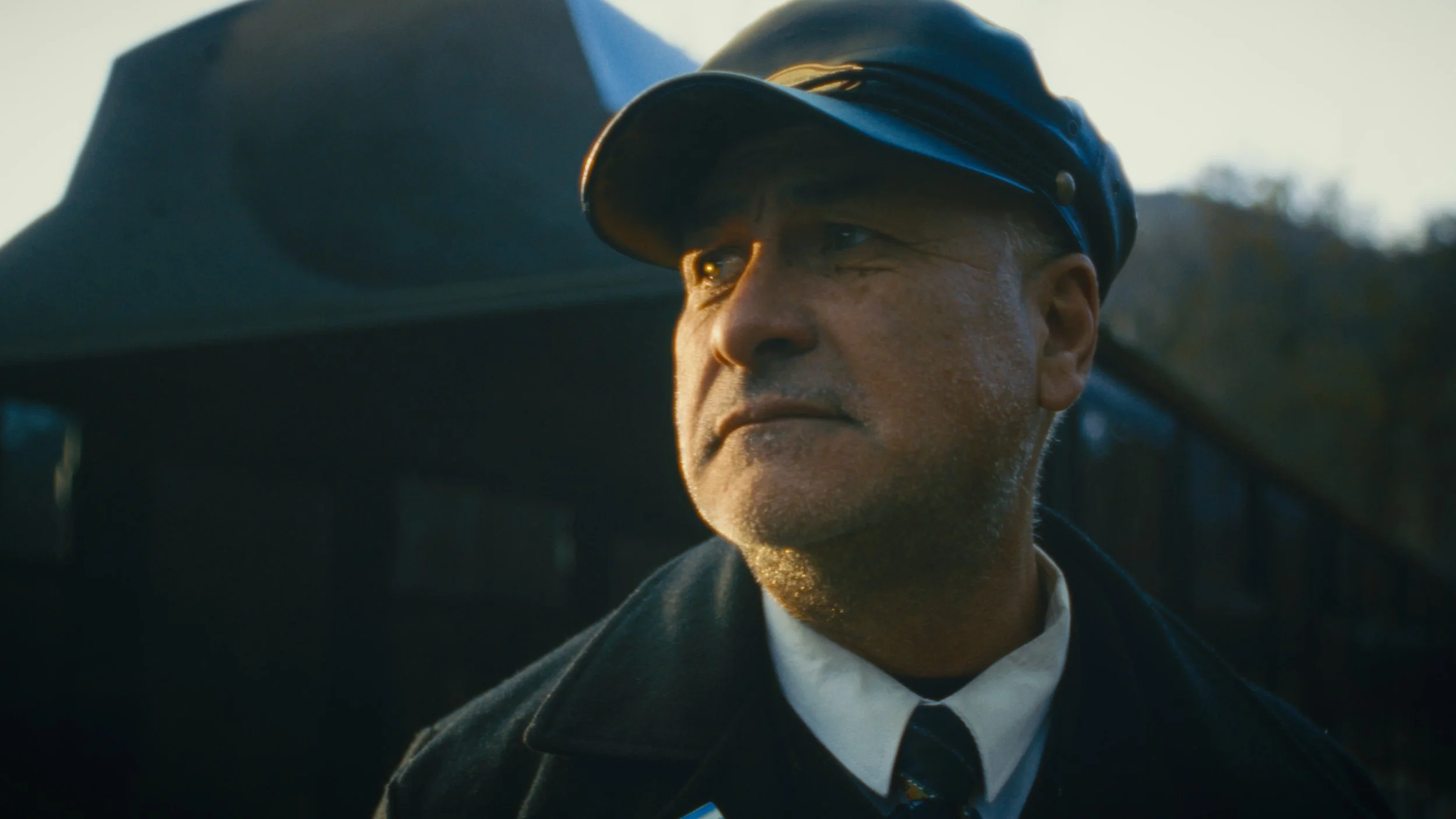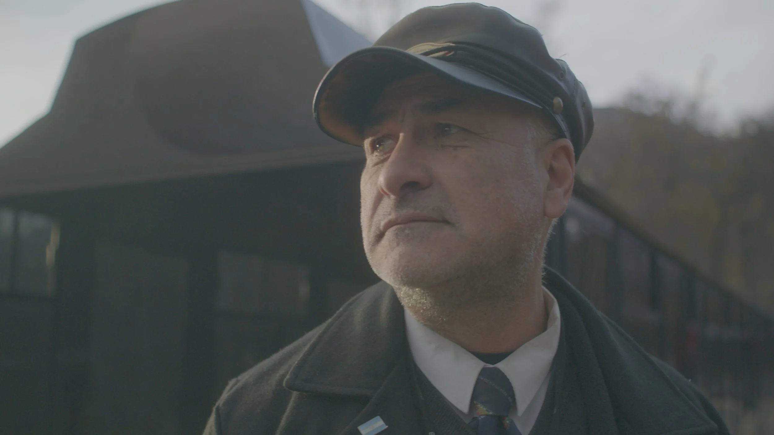 A man in a uniform and cap looks off into the distance with a serious expression. The background shows a building and trees.