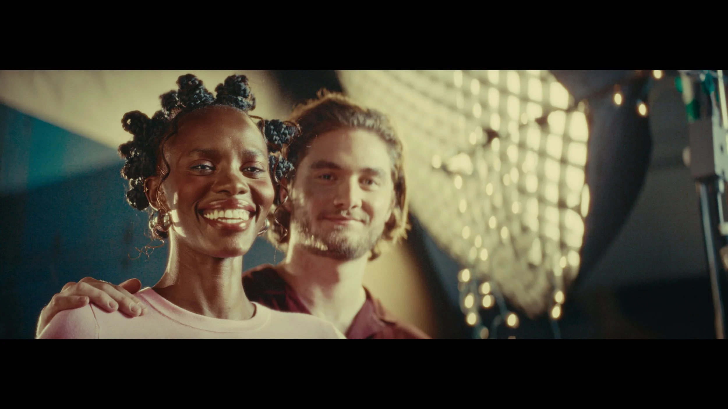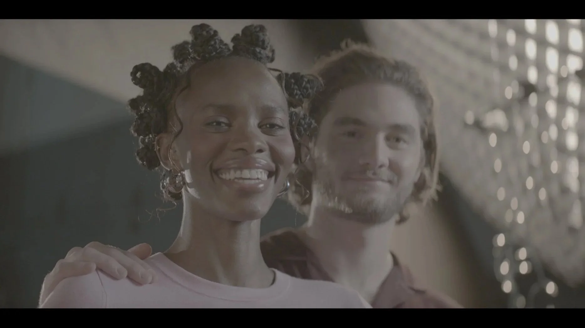 A woman with curly hair styled in bantu knots smiling with a man with shoulder-length hair standing behind her, both looking at the camera. The background is softly lit with bokeh lights.